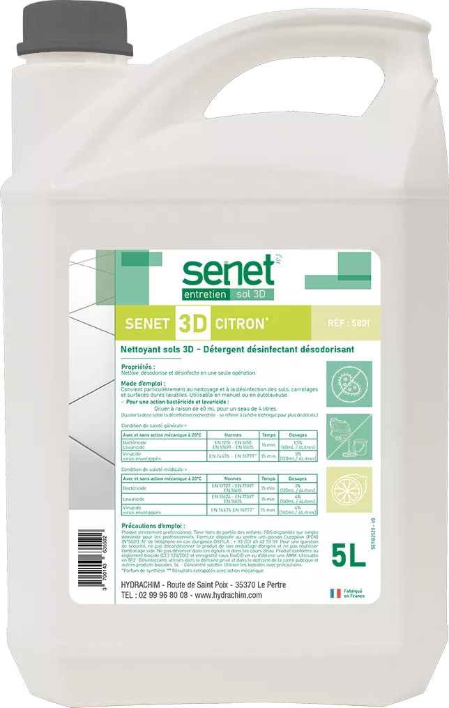 Le SENET 3D CITRON est un détergent, désodorisant et désinfectant développés pour nettoyer, désodoriser et désinfecter les surfaces.