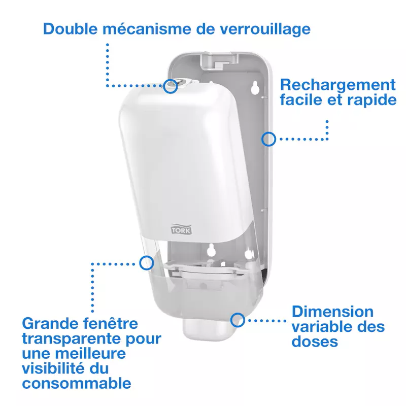 Le distributeur de savon liquide et/ou mousse Tork s’adapte à tous types de sanitaires et peut s’utiliser avec une grande variété de savons, désinfectants et lotions Tork en bouteilles scellées pour s’adapter aux besoins de votre entreprise. Sa distribution fiable, sa taille de dose variable et son design certifié facile à utiliser favorisent une bonne hygiène des mains pour tous les utilisateurs. Améliorez votre image auprès de vos clients grâce au design fonctionnel et moderne de notre distributeur de savon et désinfectant le plus polyvalent.